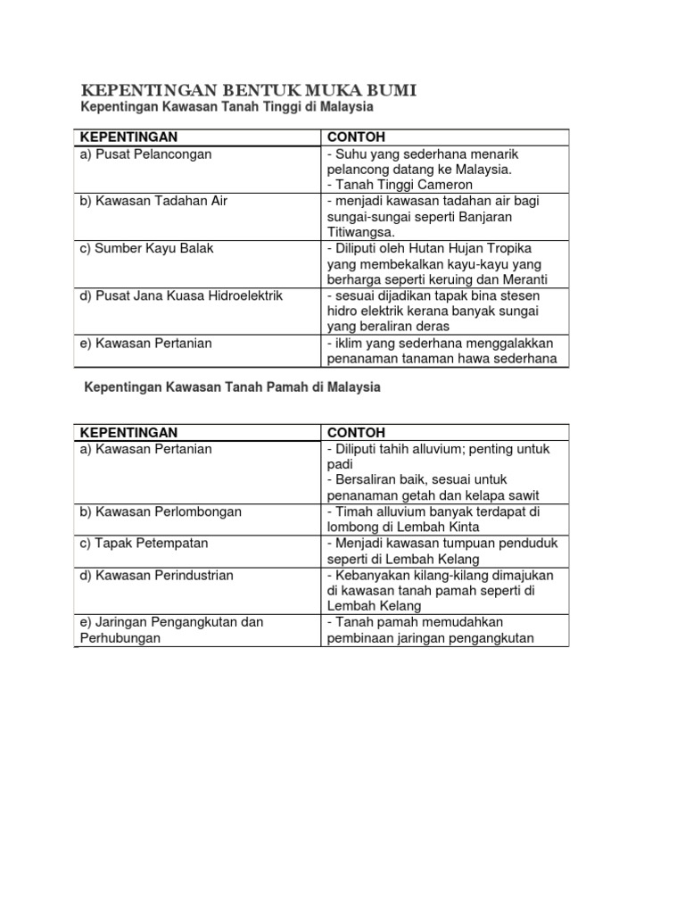 5 dataran tinggi (plato) dataran tinggi adalah tanah datar yang tinggi dengan ketinggian ratusan sampai ribuan meter di atas permukaan air laut. Lebih 60% daripada muka bumi negara kita terdiri tanah tinggi. Malaysia diliputi oleh beberapa banjaran utama. Pada lereng yang curam, batuan akan dengan sangat mudah terkikis. Dataran rendah salah satu bentuk muka bumi adalah dataran rendah yang merupakan hamparan luas tanah, bagian dari permukaan bumi dengan.