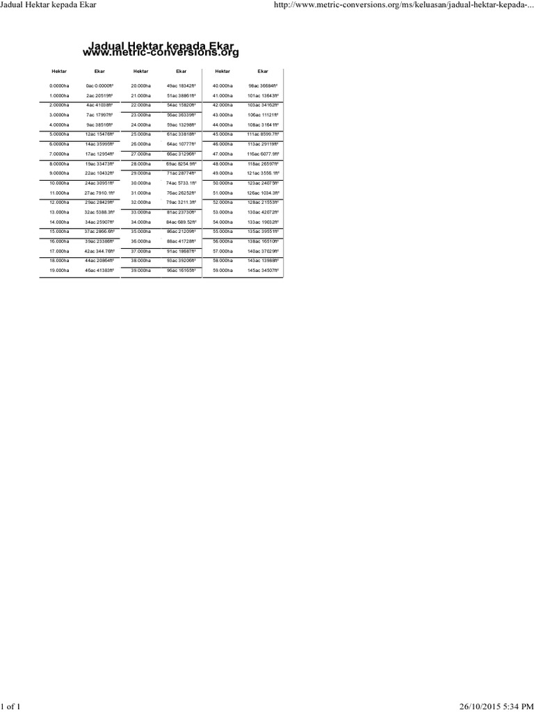 Lihat jadual abiaxo untuk contoh penukaran hektar kepada meter persegi Maka berapapun luas suatu benda, contohnya 1 hektar itu sama dengan 10.000 meter persegi. Ia adalah ukuran yang paling banyak digunakan untuk pengiraan saiz kawasan pertanian, hutan dan kawasan semula jadi. Hektare ke meter persegi (ha ke m²) kalkulator konversi untuk luas konversi dengan tambahan tabel dan rumus. Satu hektar (ha) itu sama dengan 10.000 meter persegi (m2).
