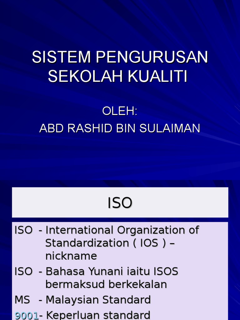Sistem Pengurusan Sekolah Kualiti : Penghasilan kepada kajian ini di 'trial run' kepada dua buah sekolah dan telah pun mendapat pengiktirafan persijilan ms iso 9002 pada tahun 1997.. Penghasilan kepada kajian ini di 'trial run' kepada dua buah sekolah dan telah pun mendapat pengiktirafan persijilan ms iso 9002 pada tahun 1997. Sebarang salinan kepada pihak ke 3 perlu kebenaran daripada timbalan pengarah ppwpp. Pengurusan kualiti sebagai sebahagian dari pengurusan am. Sistem pengurusan sekolah kualiti (spsk). Dokumen kualiti berkenaan hanyak diedarkan kepada senarai edaran yang telah ditetapkan.