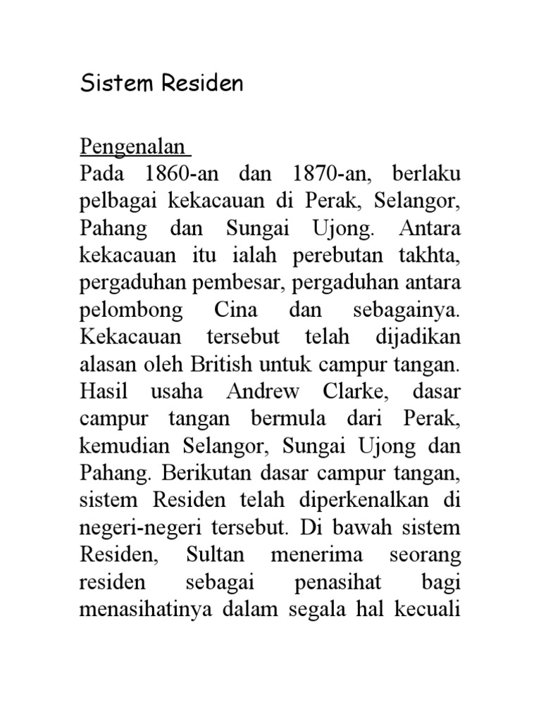 Sistem Residen Di Tanah Melayu : Mengikut sistem residen, residen ialah seoang pegawai british yang dilantik untuk menasihati sultan dan nasihatnya itu mesti dipatuhi dalam semua.. Mengambil alih kuasa memungut cukai daripada pembesar melayu dan menimbulkan kemarahan. Sebelum ini kekacauan yang berlaku di tanah melayu ditangani dengan terpaksa mendapatkan bantuan dari singapura, hong kong dan india. Jawatan residen ialah 1 strategi british untuk menjaga kepentingan mereka di tanah melayu. Sistem ketatanegaraan dipelajari di dalam ilmu politik. Sejarah awal trm di tanah melayu • 1908 :