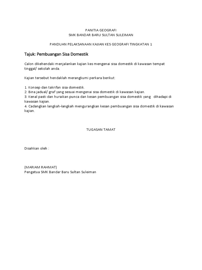 Contoh Kaedah Kajian Geografi from imgv2-1-f.scribdassets.com 1) membuat tinjauan dan menganalisis mengenai pembuangan dan sisa dengan lebih mendalam. Objektif kajian geografi sisa domestik reka bentuk industri tingkatan 2 reka bentuk dan pembangunan permainan reka cipta bahan terbuang covid 19 reka bentuk dan teknologi rasulullah is my doctor free pdf reddy clinic jalan ipoh reka bentuk sistem akuaponik rbt reka bentuk dan teknologi tingkatan 2 reka bentuk elektrik recommended nutrient intake malaysia rate of heat transfer by radiation formula Objektif kajian secara khusus kajian ini bertujuan untuk: 1) menyatakan jenis sisa domestik (lisan) 2) menjelaskan dengan 2 contoh sisa domestik di malaysia (lisan) 3) membincangkan kesan pembuangan sisa domestik di malaysia. Lukis peta lakar (peta topografi) melibatkan taburan guan tanah di kawasan kajian; Mengkaji kesan kesan sisa domestik 5. Sisa domestik ini terdiri daripada sisa pepejal dan sisa cecair. Menyenaraikan langkah langkah mengurangkan kesan pembuangan sisa domestik kawasan kajian